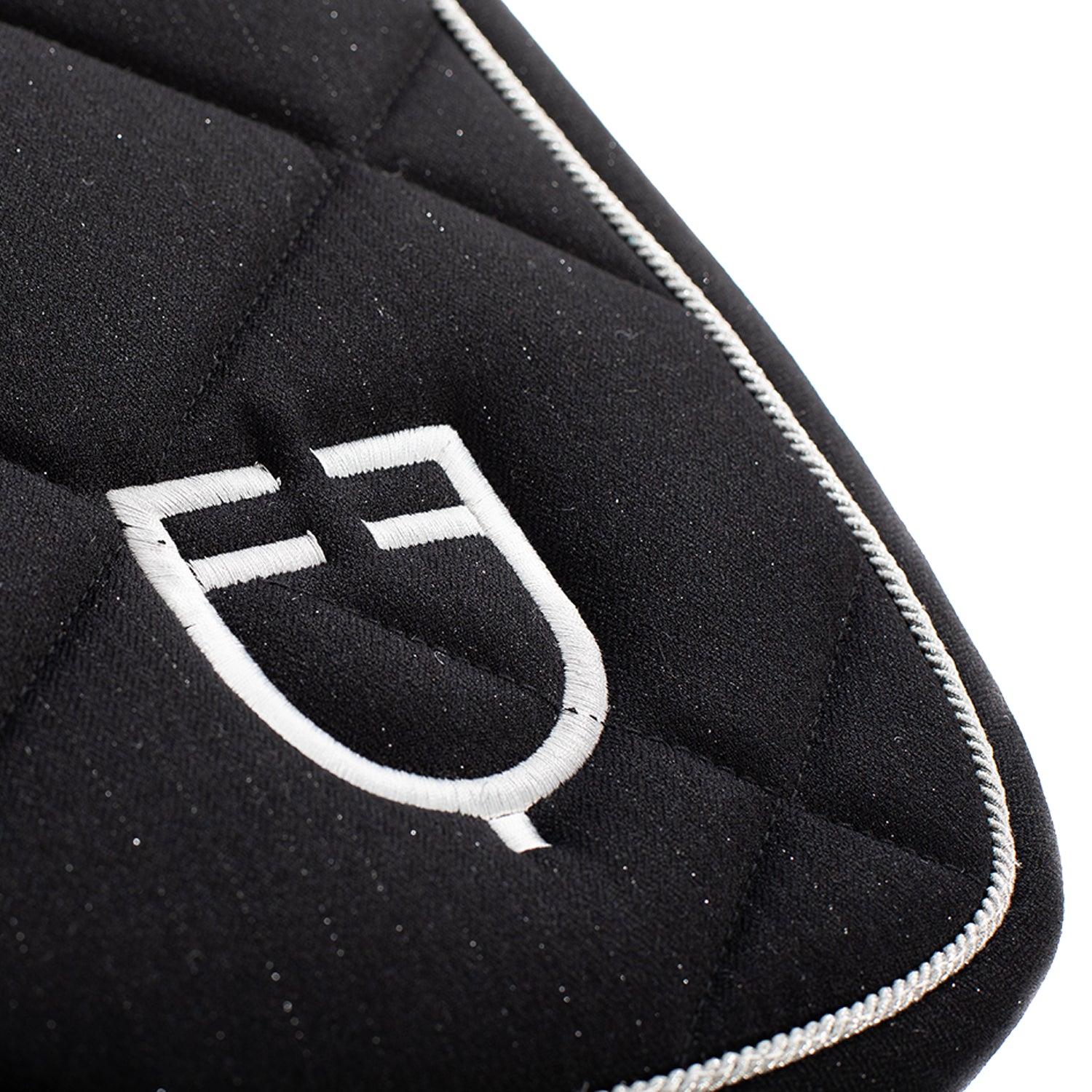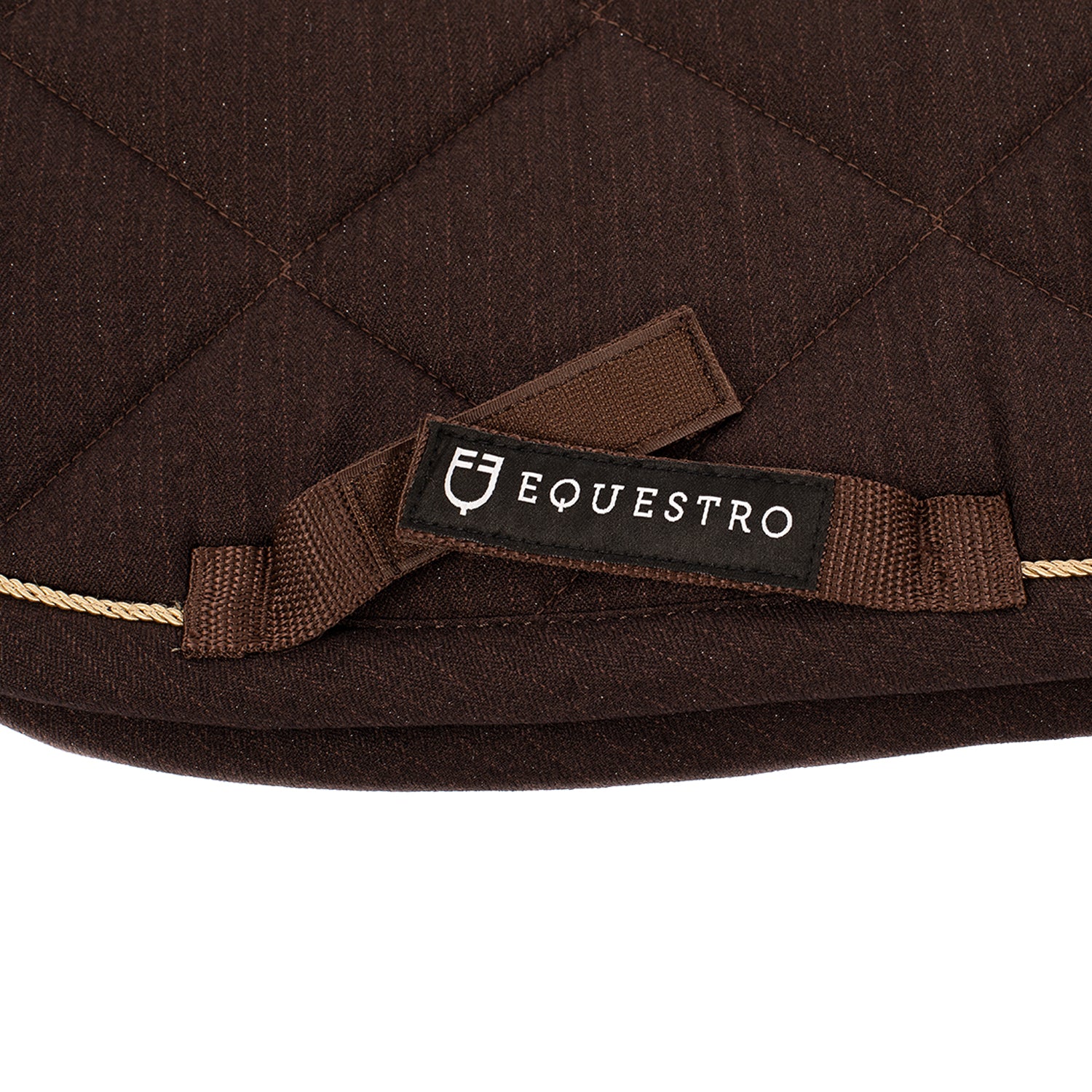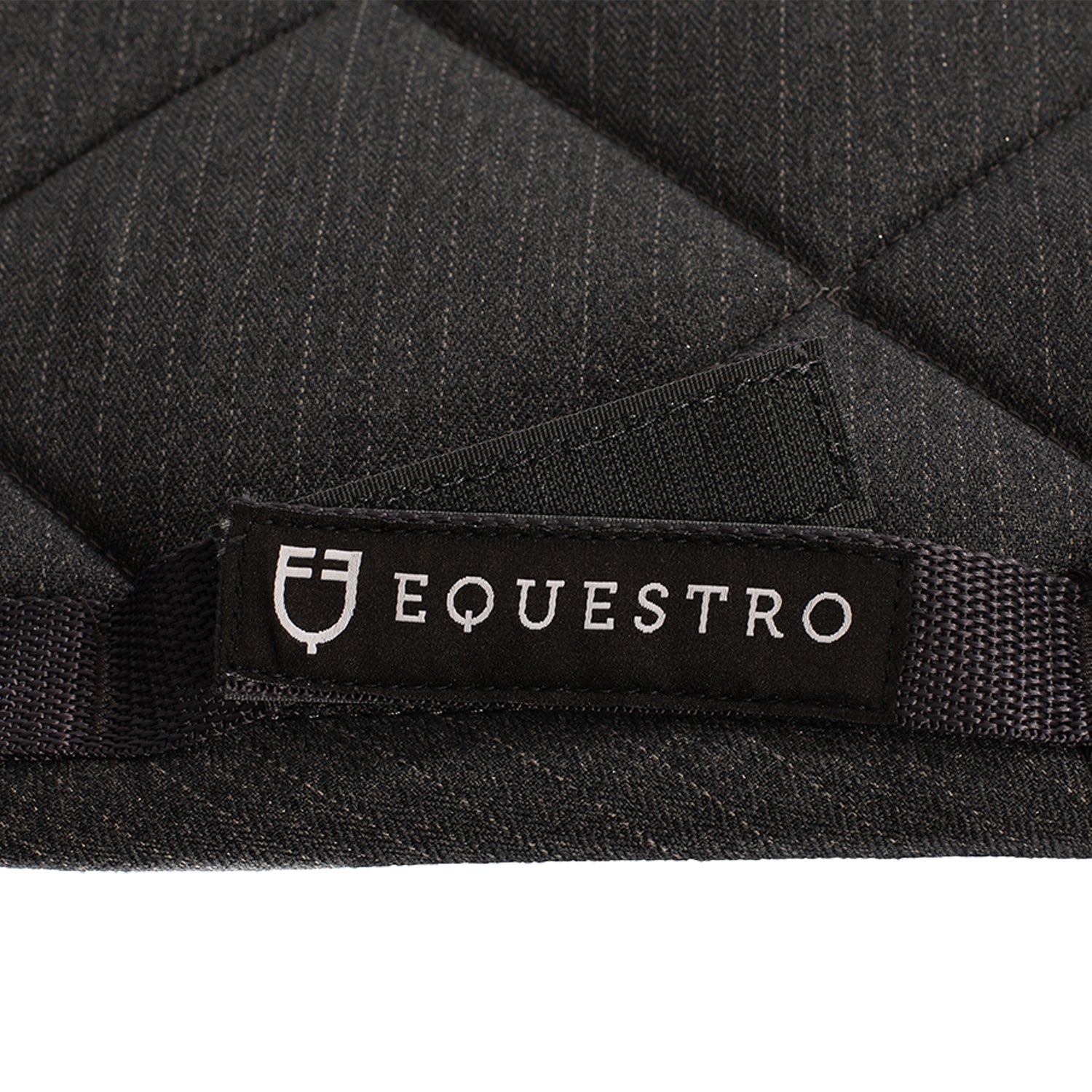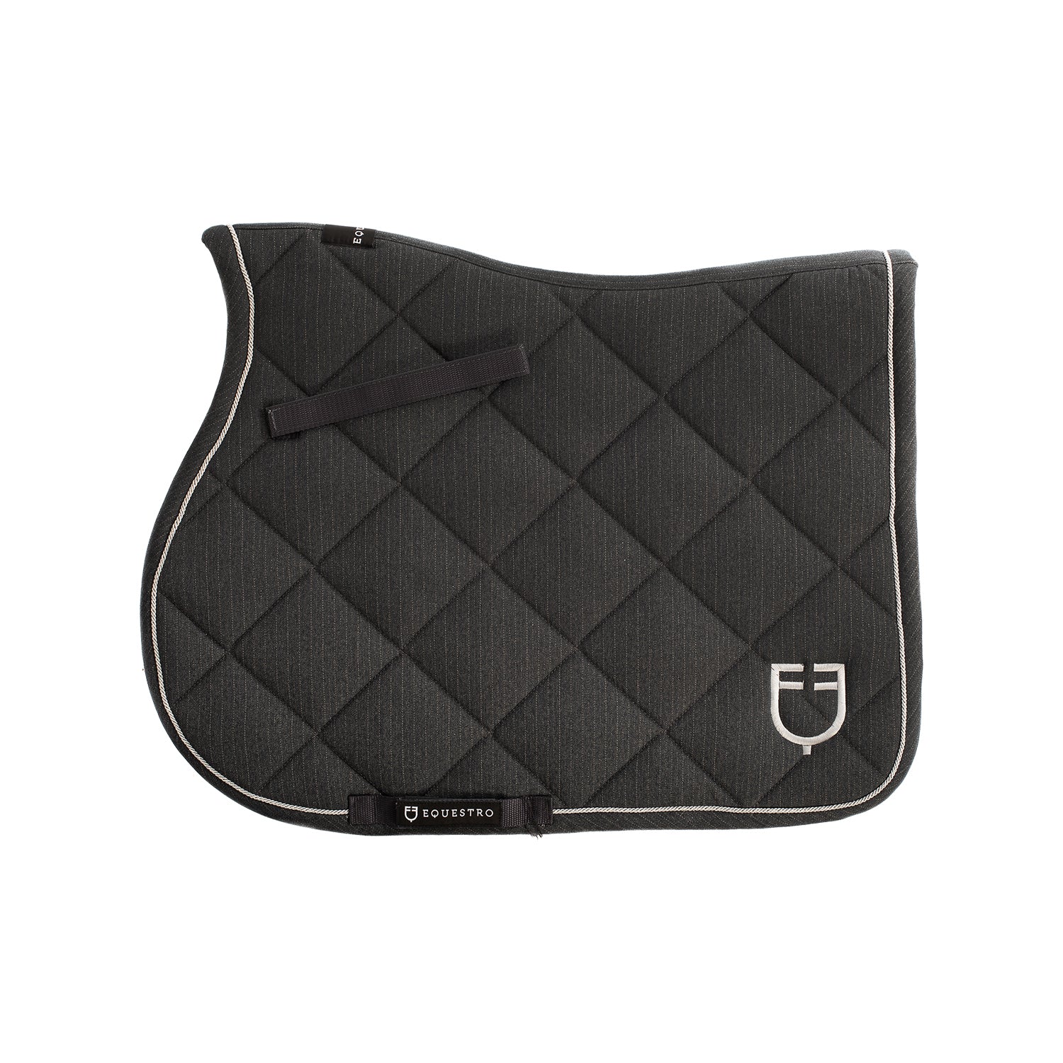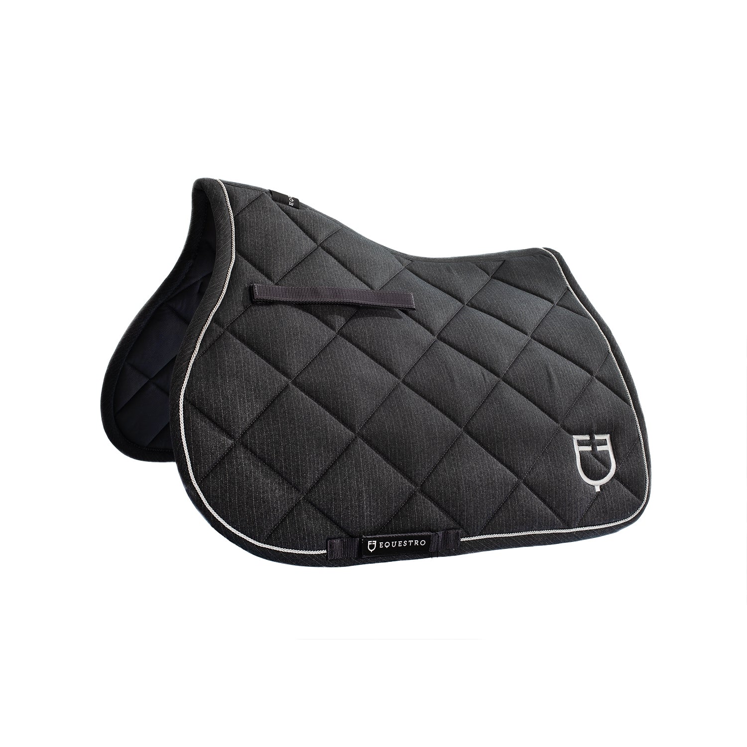 Jumping saddle pad in breathable cotton, embroidered Equestro logo and loops with velcro closure with logo. Logo patch on the withers. The Equestro Jumping Saddle Pad combines padded cotton construction with reinforced girth areas to minimize shocks and prevent saddle displacement. Its breathable design promotes sweat evaporation, keeping your horse comfortable during intense rides. The padded inner layer enhances anti-sweat properties, protects against skin lesions, and absorbs impact. Finished with elegant trimmings, a contrasting logo, and Equestro branding, this saddle pad offers both durability and style for serious riders.