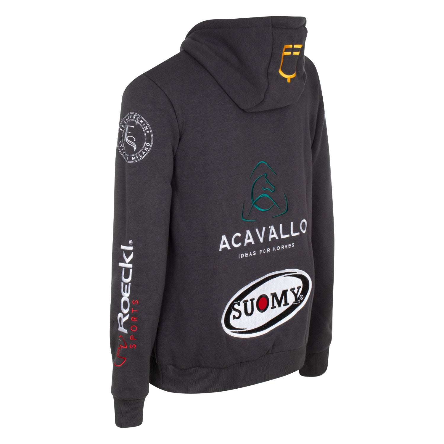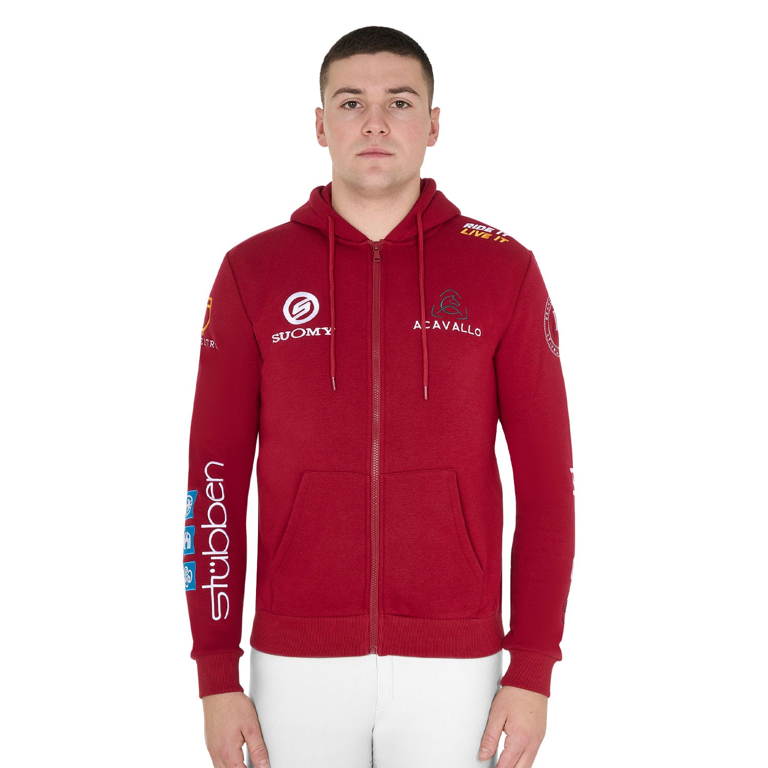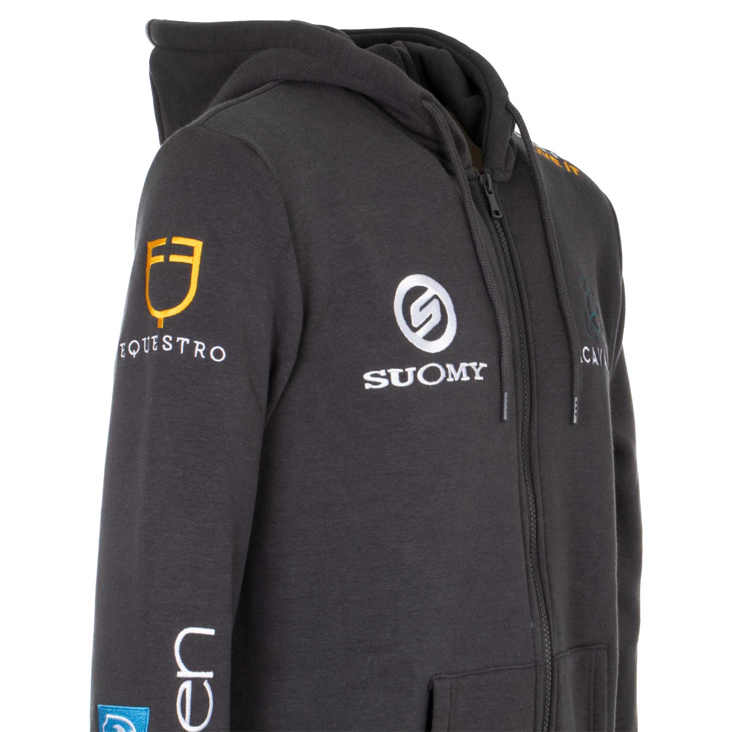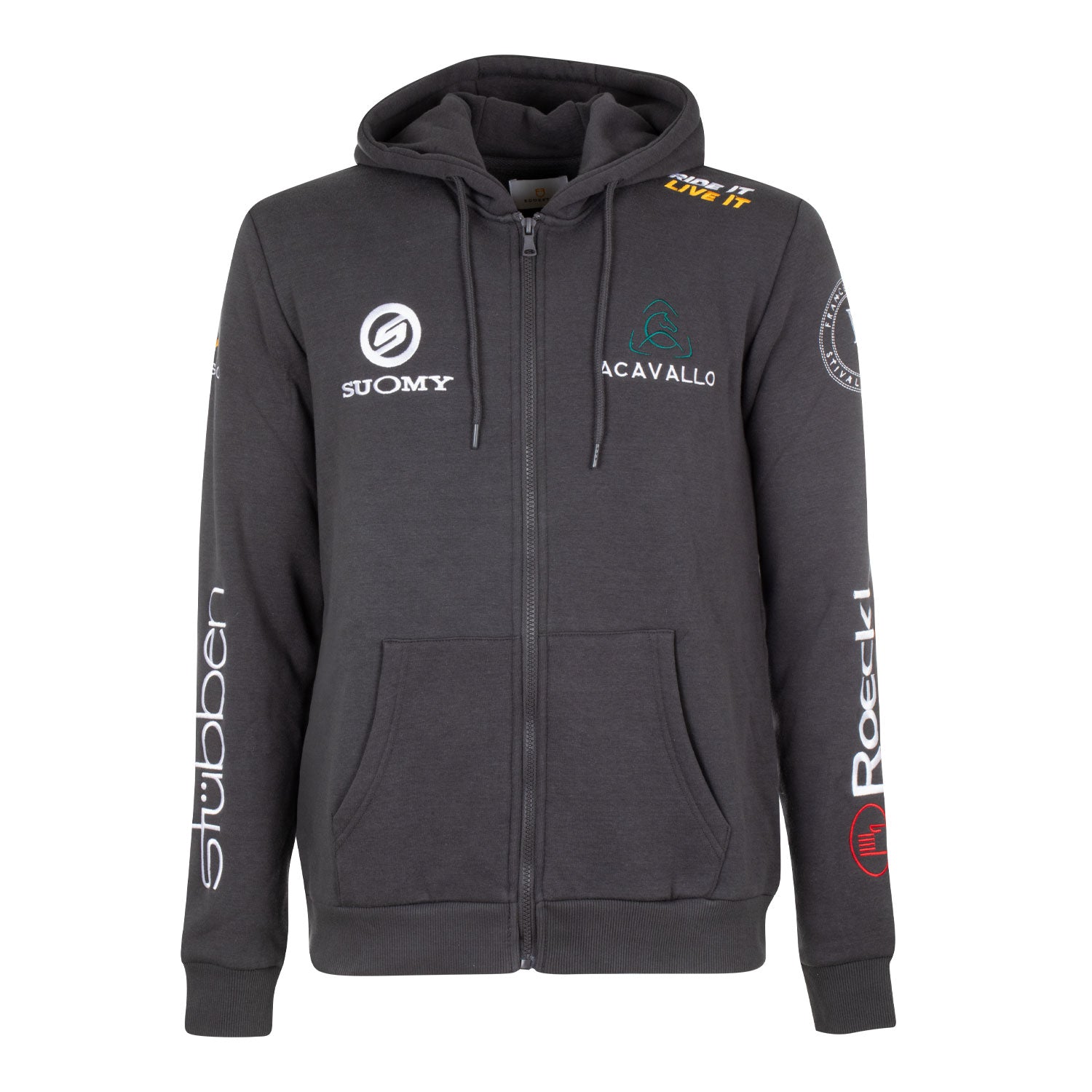 - Patches detail with embroidered riding brand logos.