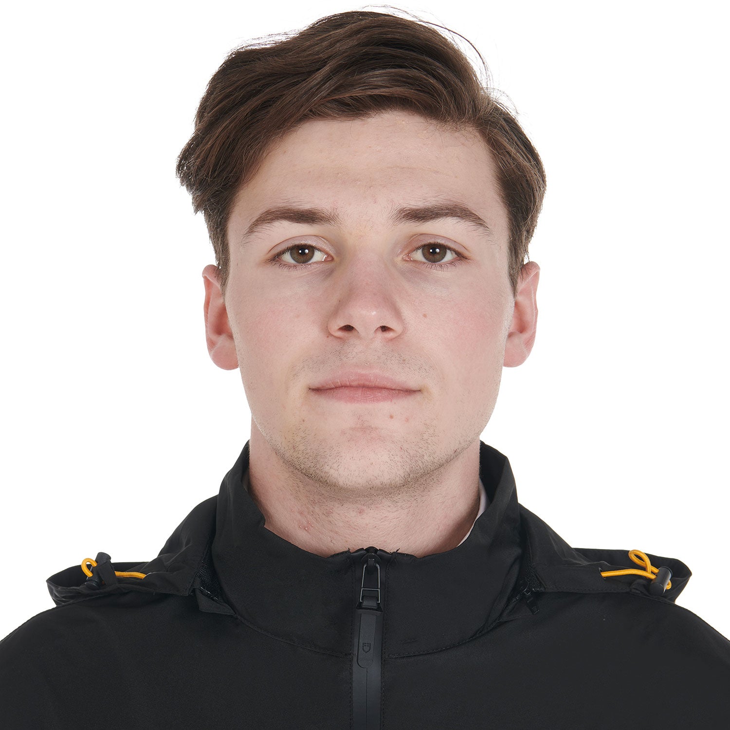 The Equestro Men's Three-Layer Technical Raincoat offers superior protection with its water-repellent, breathable membrane and fully thermo-laminated seams and zips. Designed for maximum comfort and freedom of movement, it features an adjustable hood with removable visor, double slider zip, and customizable waist and wrist drawstrings. Ideal for training or racing in wet, windy conditions, this raincoat keeps you dry and comfortable no matter the weather.
