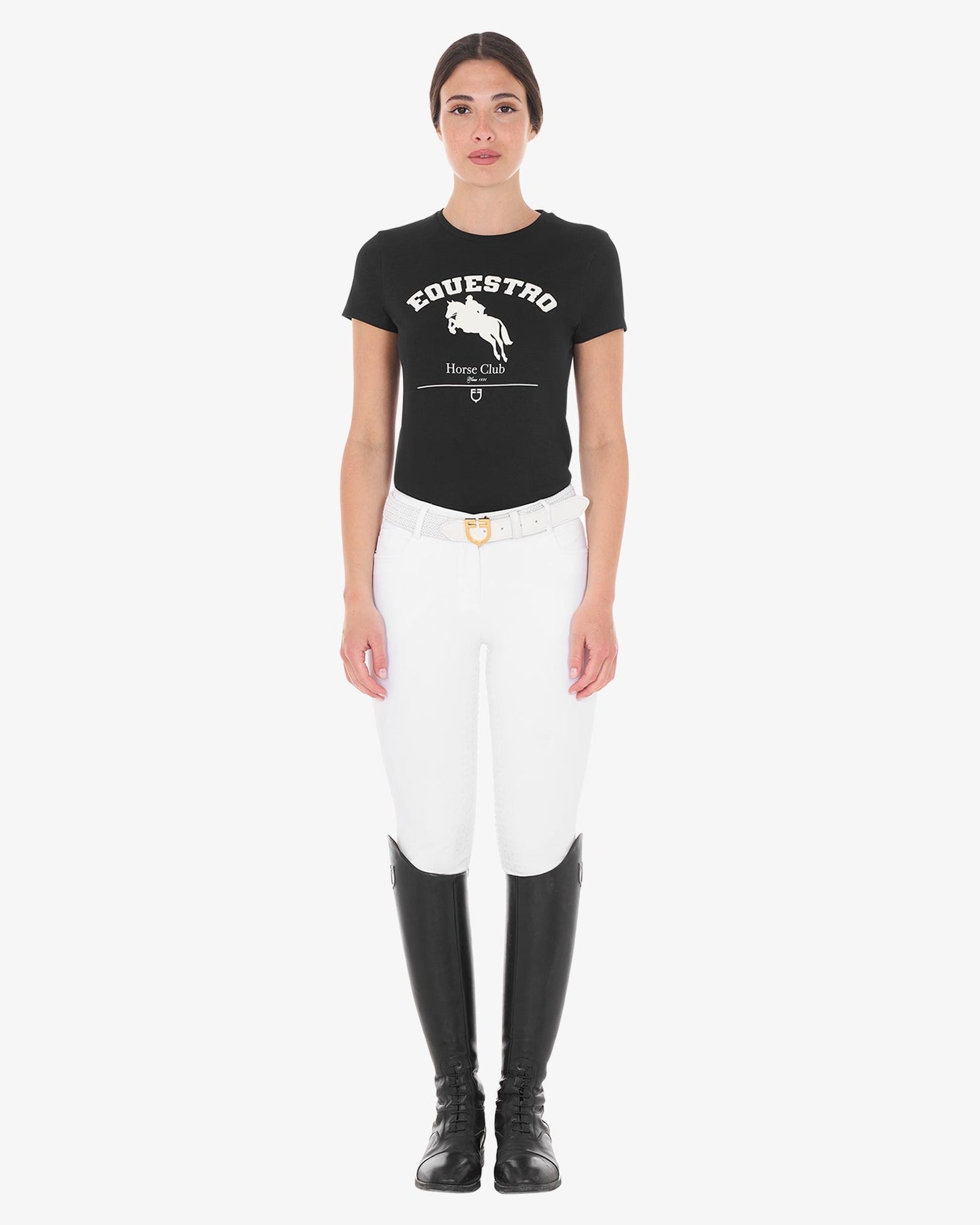 Cotton allows it to absorb moisture, making it an excellent choice for anyone who practices horse riding. The peculiarity of this garment is given by the print depicting the silhouette of a horse with Equestro logo and lettering in college style.