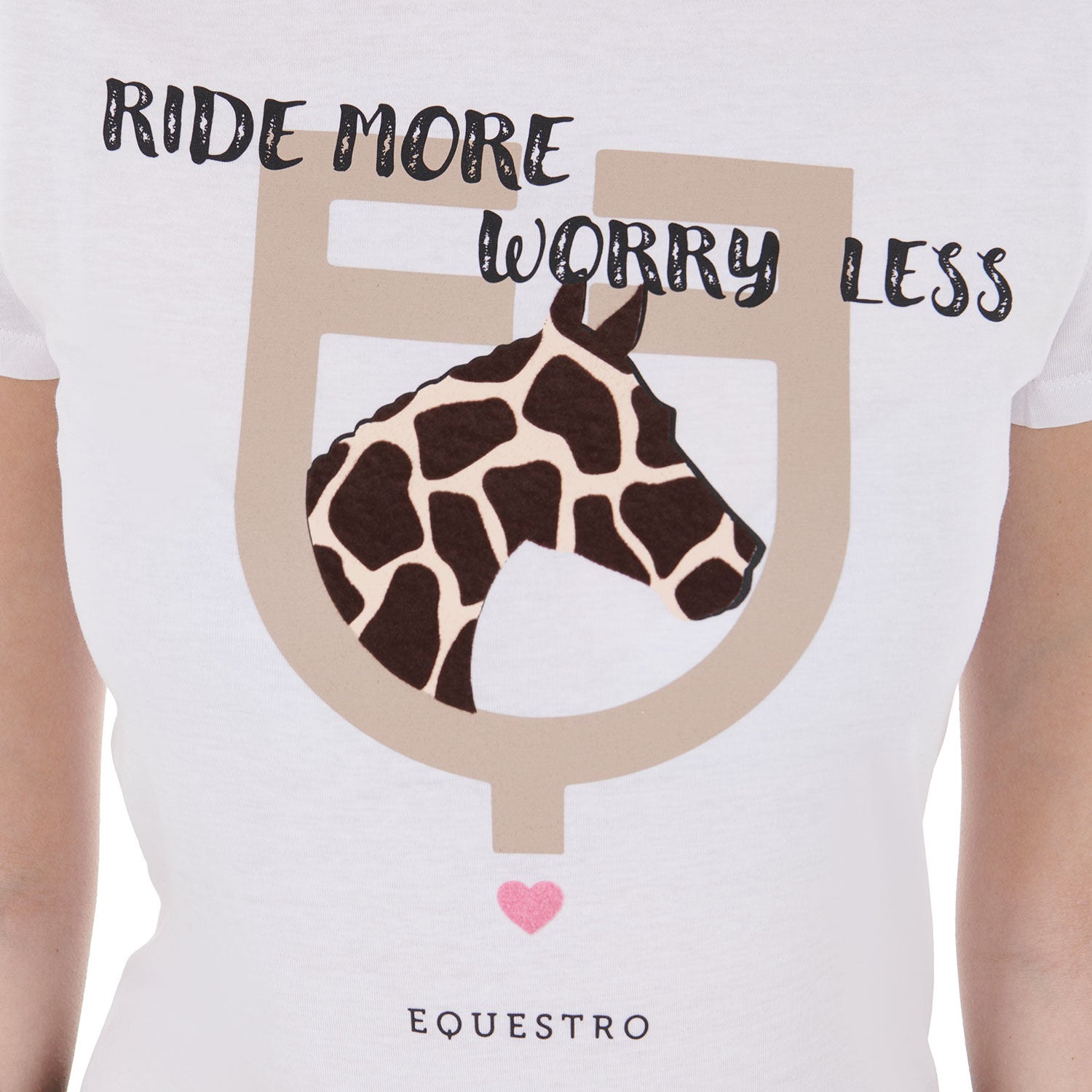 Women's slim fit cotton T-shirt with cute writing and front logo. Perfect combination of comfort and elegance thanks to its refined details. Women's slim fit T-shirt made of soft high-quality cotton to ensure maximum freedom of movement and unique comfort. Cotton allows to absorb moisture, making it an excellent choice for anyone who practices horse riding. The peculiarity of this garment is given by the print depicting the silhouette of a horse in a spotted motif, the Equestro logo and it is further embellished by the fun writing RIDE MORE WORRY LESS. The composition of the garment offers an elegant texture and an incredible sensation of softness to the touch, ensuring an experience of unparalleled comfort.