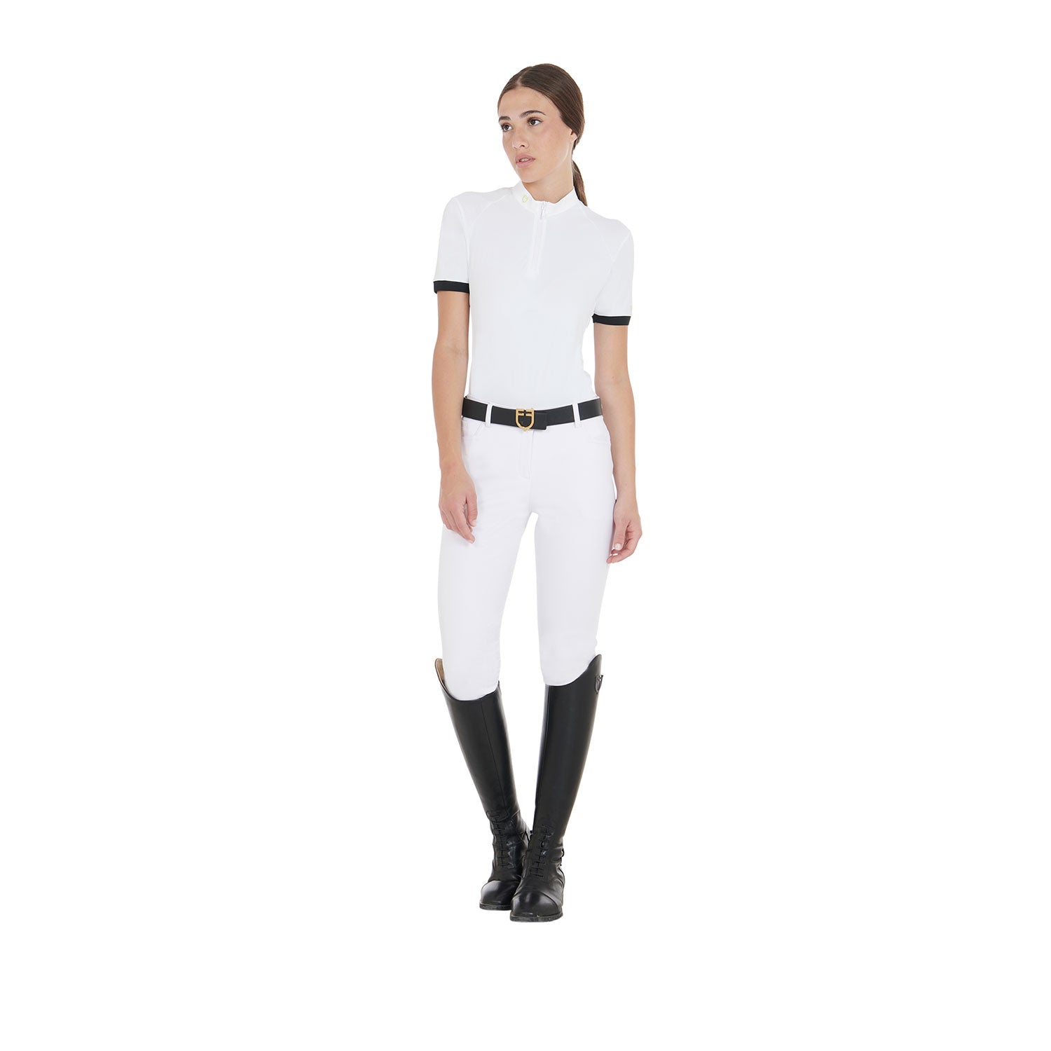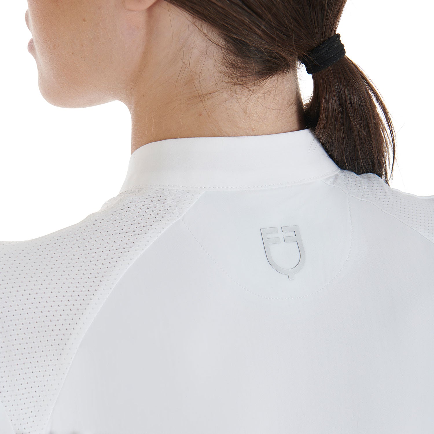 Women's slim fit polo shirt in technical fabric with contrasting shoulder inserts. The garment is designed to guarantee top performance in training. Women's slim fit polo shirt in breathable technical fabric, perfect for achieving top performance during daily trainings. The garment has an excellent fit and adherence and allows total freedom of movement. The shoulder pads with contrasting band make the garment elegant and trendy. The polo features a zip closure with a windproof system and the Equestro logo on the collar.
