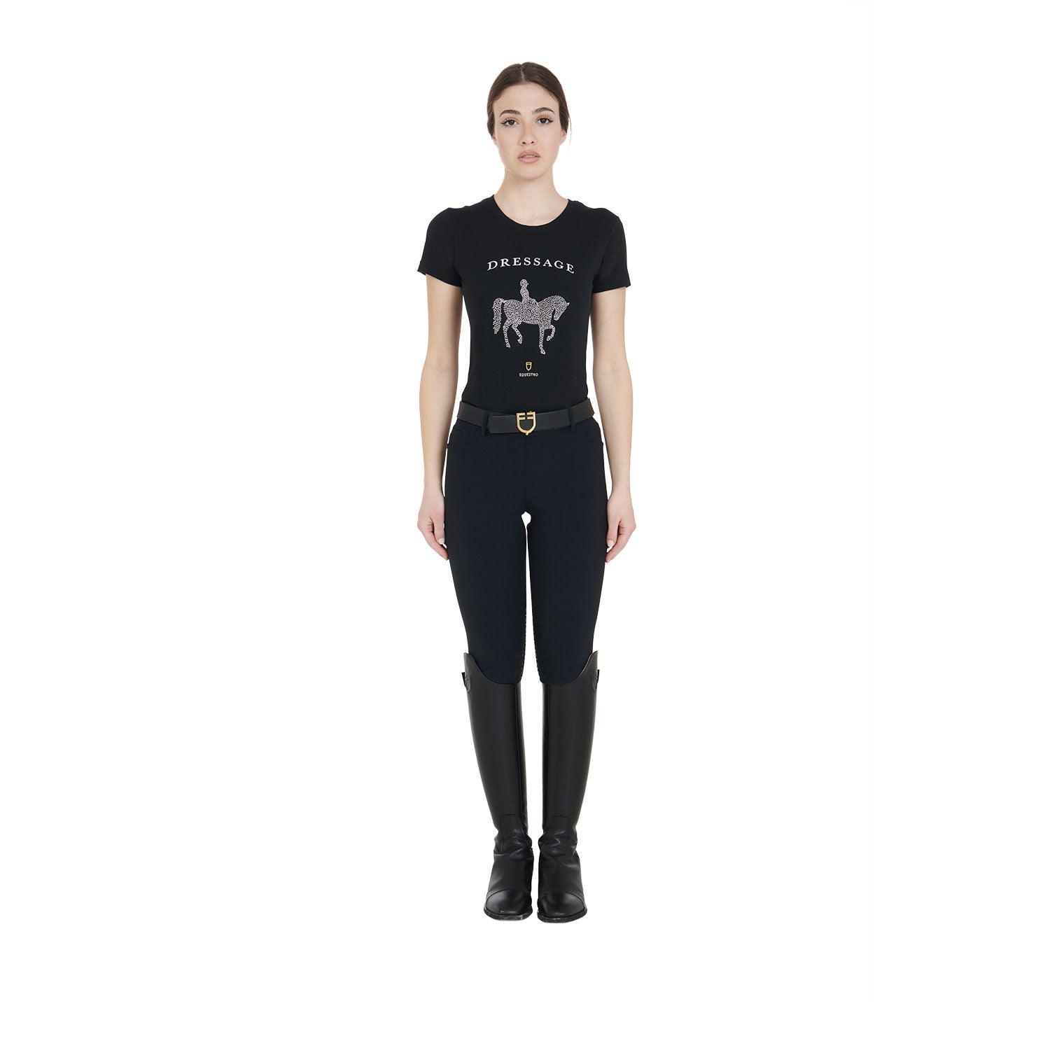 Women's slim fit half-sleeved cotton t-shirt. Elegant and refined style, perfect for both daily training and leisure. Women's slim fit cotton t-shirt with half sleeves, perfect for the summer season as it is fresh and breathable. It facilitates the evaporation and dispersion of sweat and guarantees an excellent fit and maximum freedom of movement. The t-shirt is embellished with a composition of rhinestones, "dressage" writing and the Equestro logo.