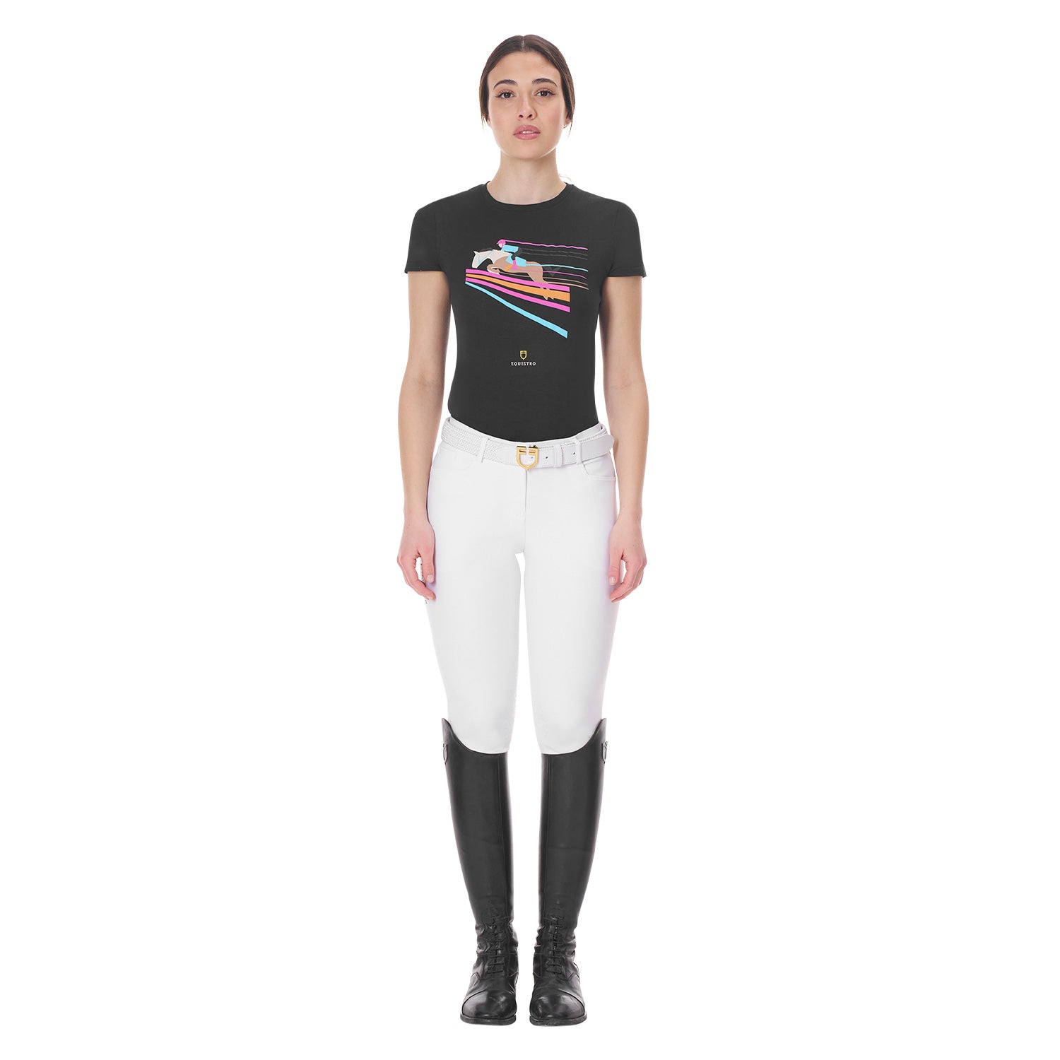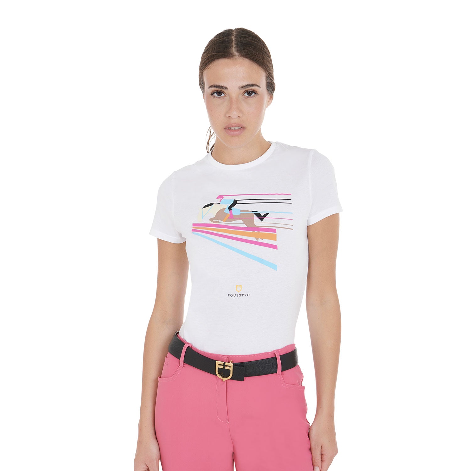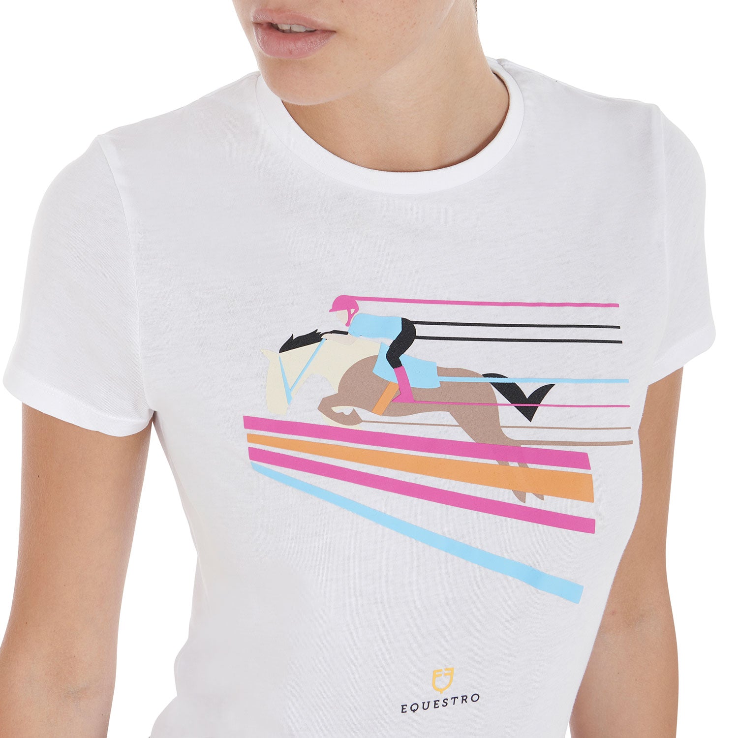 Women's slim fit short-sleeved T-shirt in elegant and refined cotton. Thanks to the colorful and elegant print, it is perfect also for leisure time. Equestro Women's Slim Fit T-Shirt with Colorful Jumping Design - ladies cotton t-shirt with a cool equestrian show jumping print. It's comfortable and easy to well. Perfect casual wear to show off your equestrian identity even when you're not riding.