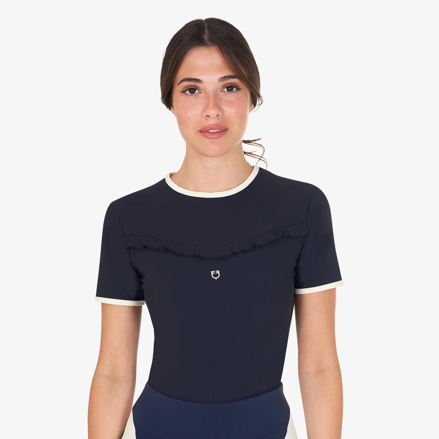 Women's slim fit technical T-shirt with ruffles on the chest and contrasting details. Designed to guarantee superior performance on every occasion. Women's training T-shirt in technical fabric that with its breathable properties maintains the ideal body temperature even when training is intense.