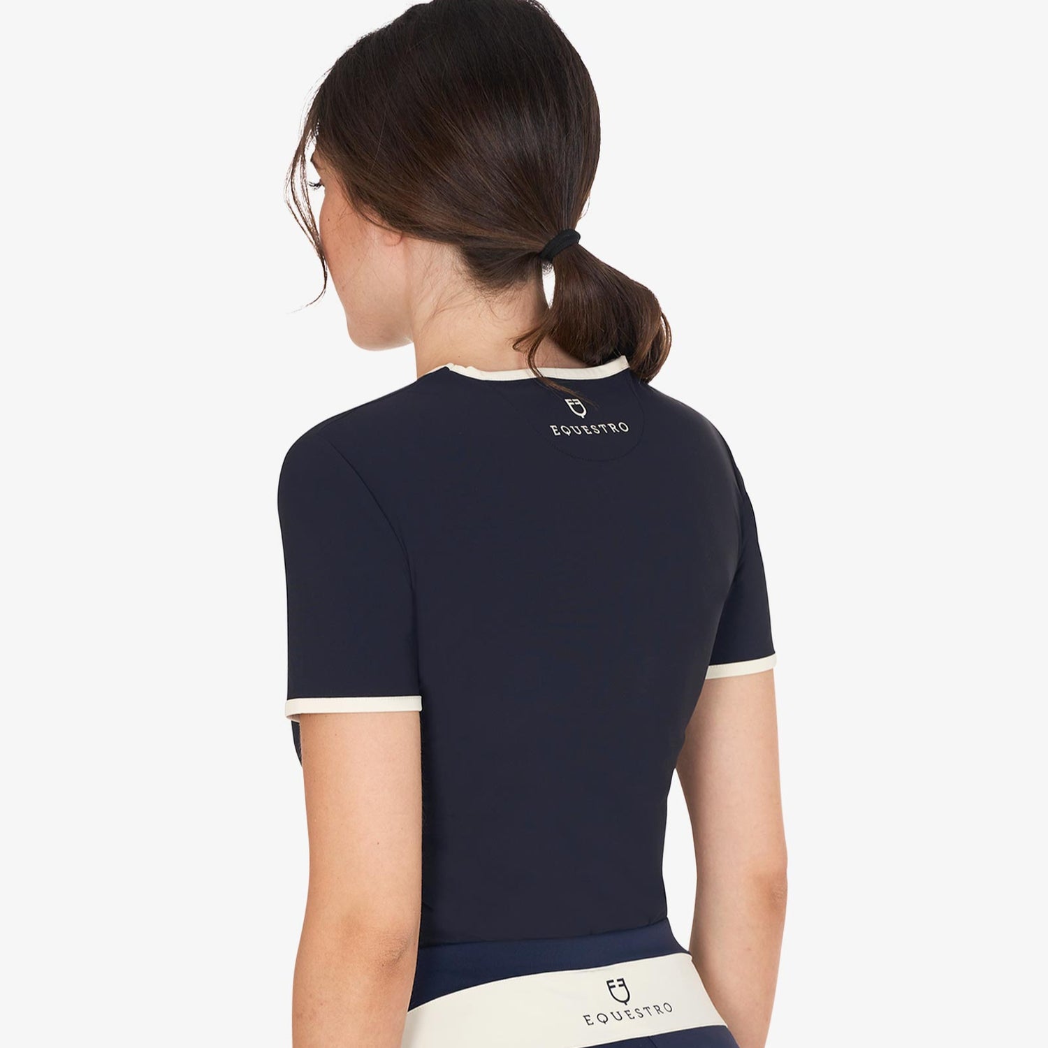 Equestro Women's Slim Fit Training T-Shirt With Chest Ruffles - Blue/White / XS is backordered and will ship as soon as it is back in stock.