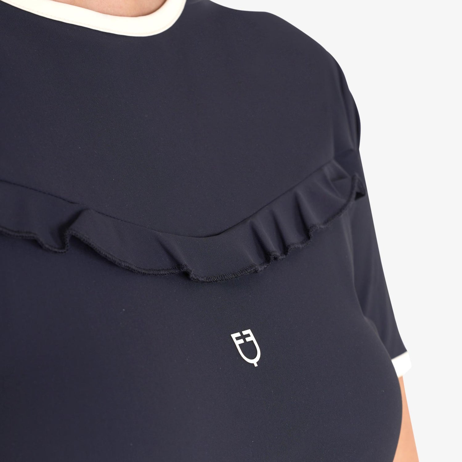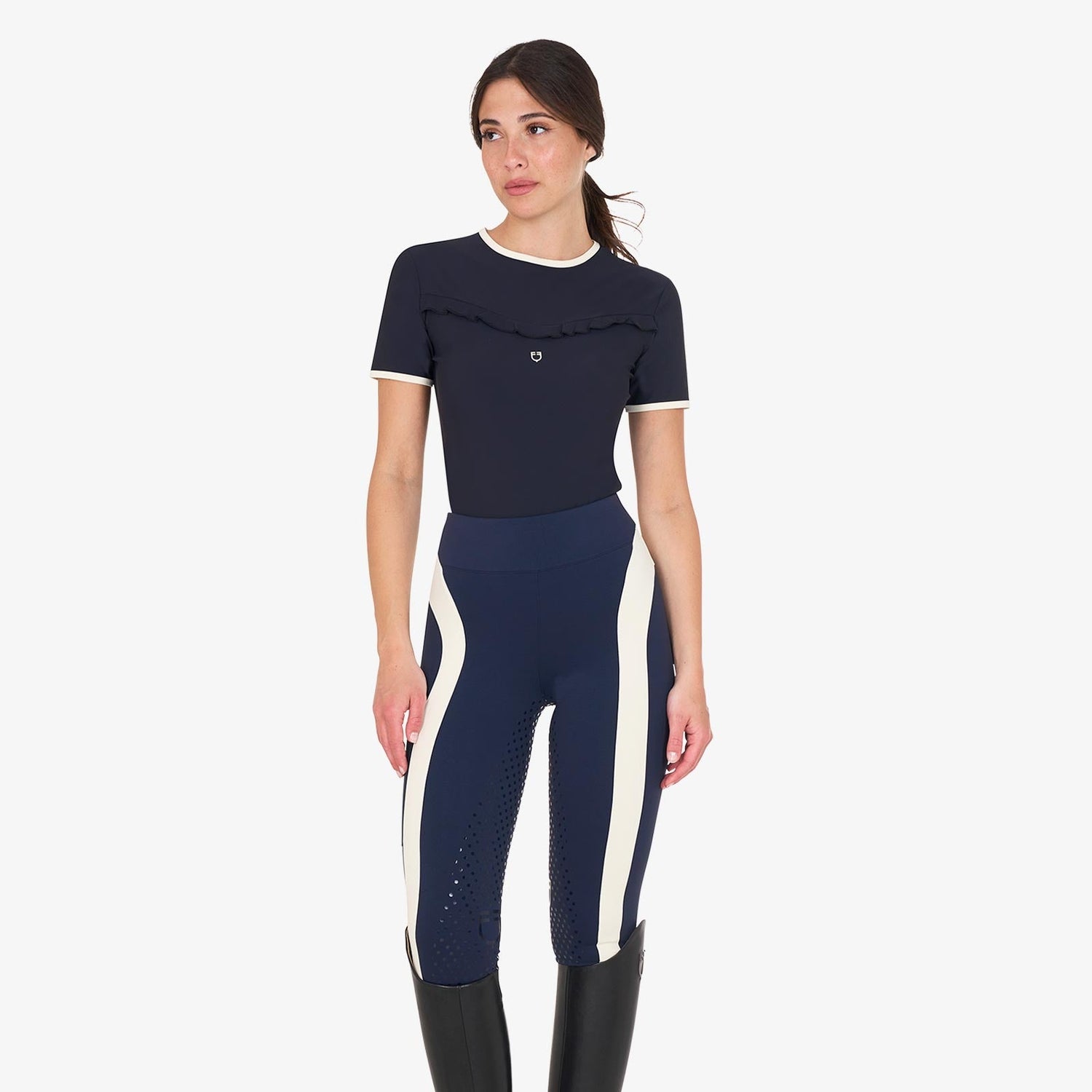The strong point of the garment is the refinement given by the details that are meticulously cared for such as the ruffle and the contrasting elasticated edges. All of these add a touch of elegance and glamour to the sports outfit and make it the perfect choice for riders looking for an item that perfectly combines fashion and performance in training.