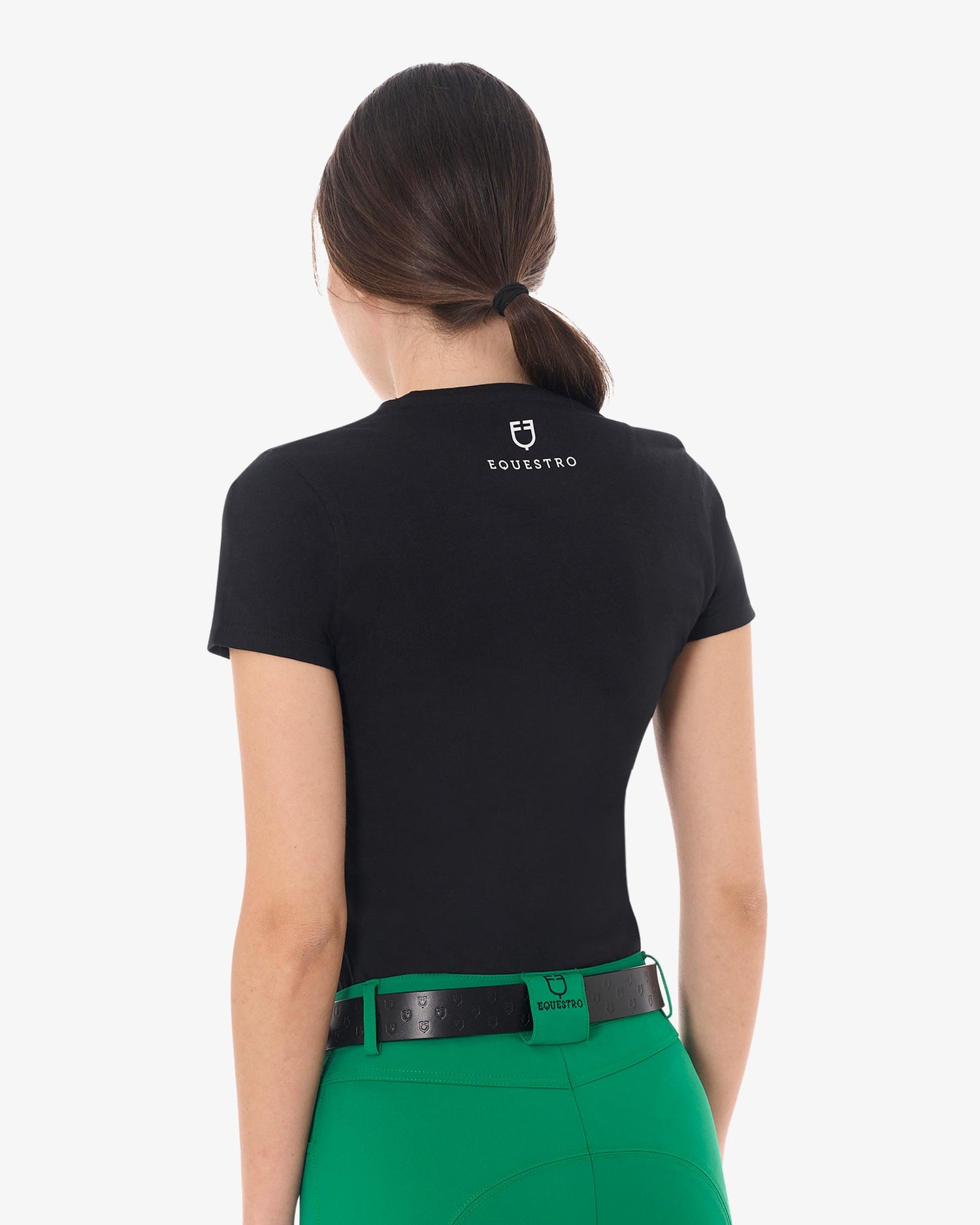 Women's slim fit short-sleeved T-shirt made of soft, high-quality cotton, for a sporty and contemporary style. Women's slim fit T-shirt made of soft, high-quality cotton, designed to offer unique comfort and maximum freedom of movement. The cotton fabric absorbs moisture, making this T-shirt the ideal choice for horse riding enthusiasts. The design stands out for its refined print depicting the silhouette of a horse, placed on a colored stripe, adding a touch of unique style to the garment. The composition of the fabric provides an elegant texture and an extraordinary softness to the touch, for unparalleled comfort.