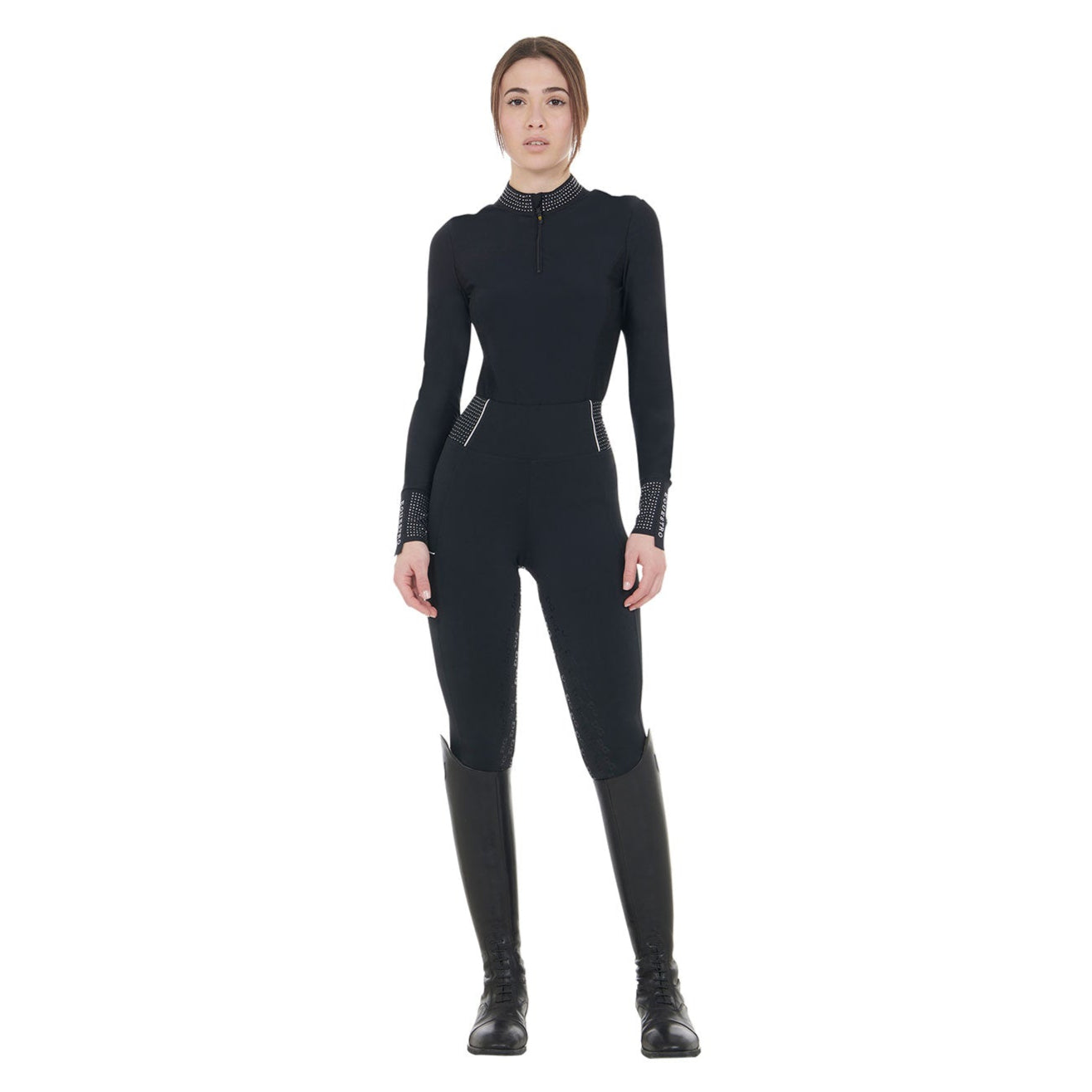 Elevate your training with the Equestro Women's Technical Polo Shirt, crafted from elastic, breathable fabric that keeps you dry and comfortable during intense workouts. Its dynamic close fit offers a sleek, sporty silhouette, while the high collar with a 3/4 zip and mesh side inserts enhance ventilation. Sparkling rhinestones on the collar and cuffs add a touch of elegance, complemented by contrasting details and Equestro lettering on the cuffs. This polo perfectly combines performance and style for the modern athlete.