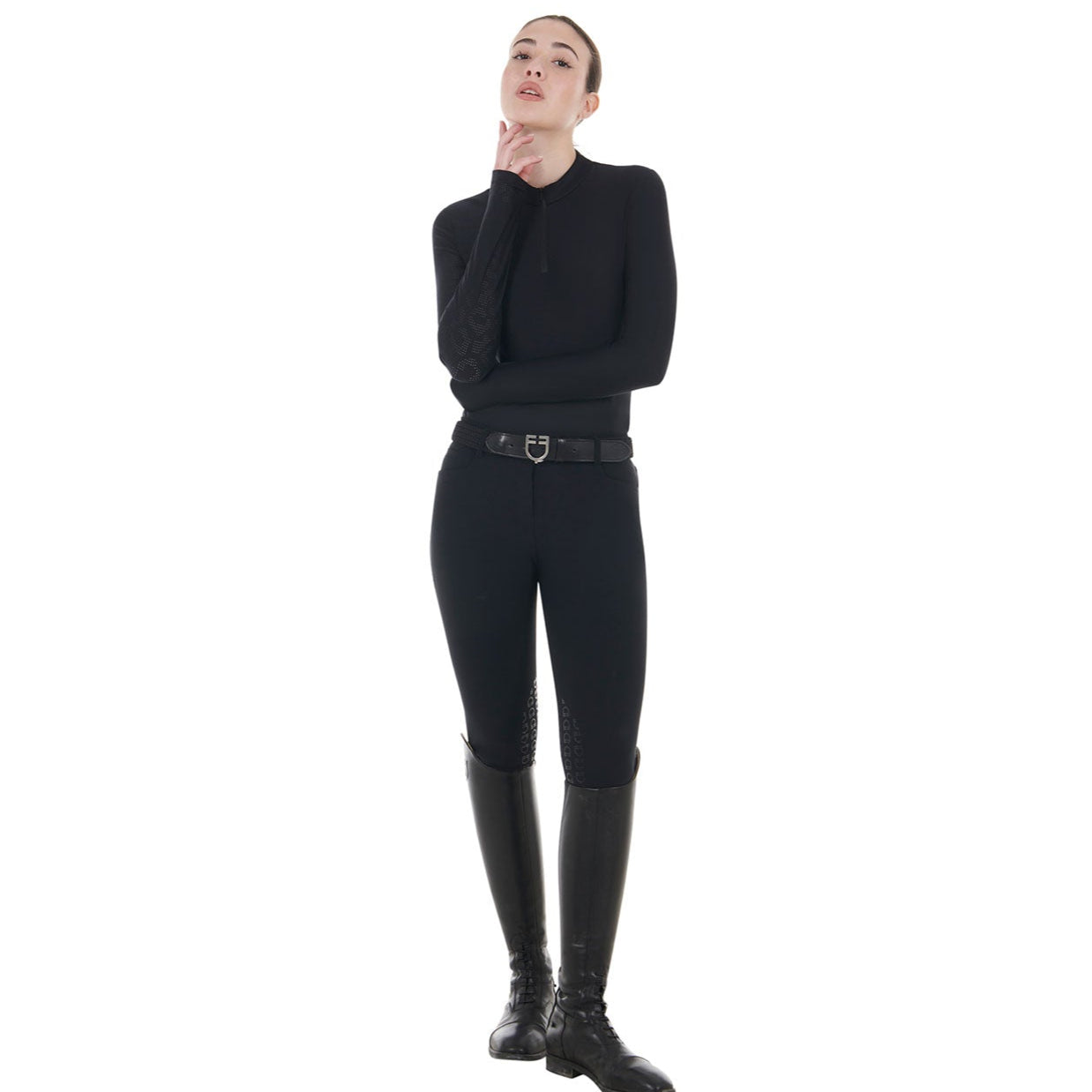 Experience peak performance and style with the Equestro Women's Training Polo Shirt. Crafted from breathable, warming stretch fabric, it keeps you comfortable and temperature-balanced during intense workouts. The slim, modern fit with a high collar and 3/4 front zip offers both practicality and a sleek look. Leopard-print mesh inserts on the sleeves and shoulders boost ventilation while adding a fashionable edge. Finished with elasticated collar and cuffs, this polo combines elegance with sporty flair, making it the perfect choice for training in style.