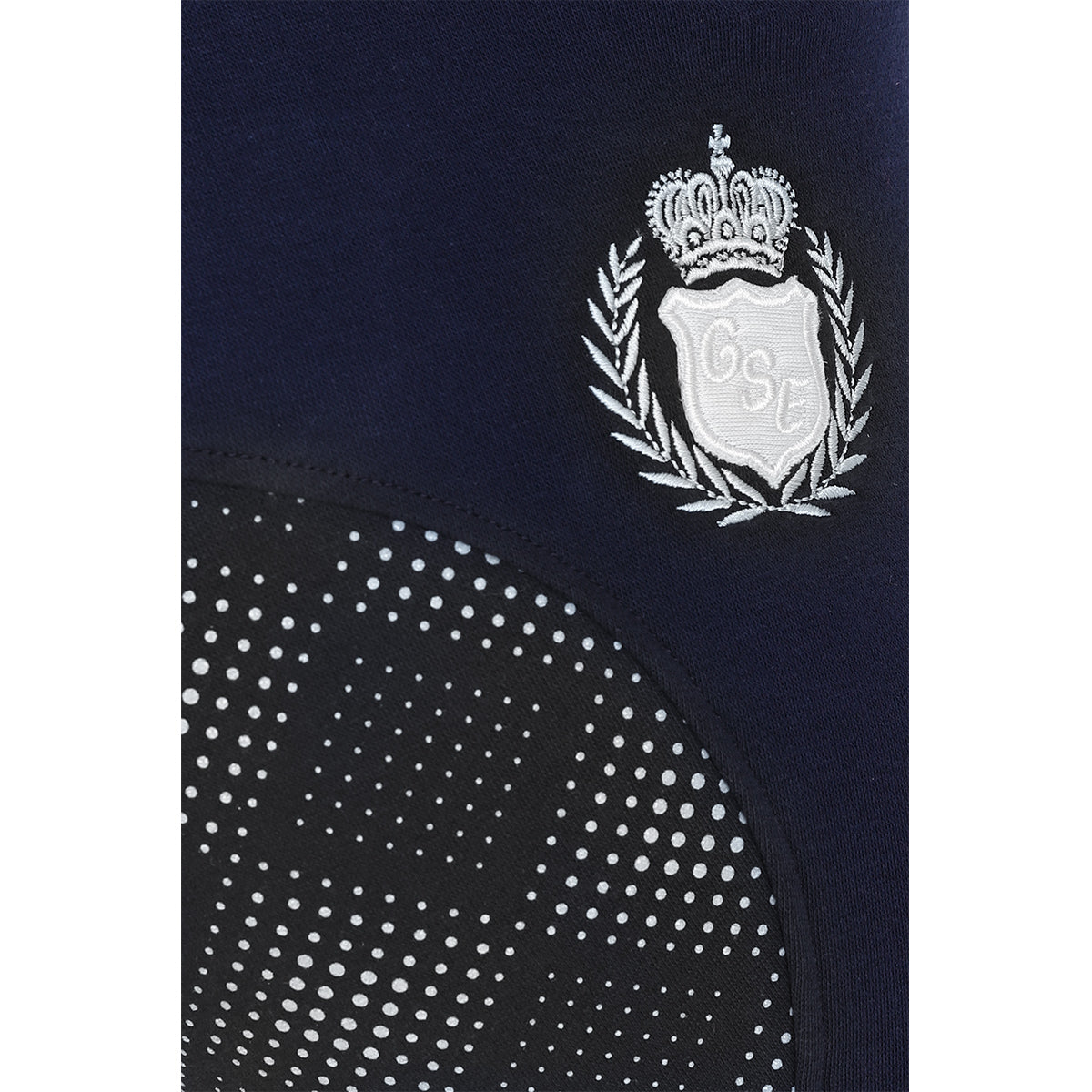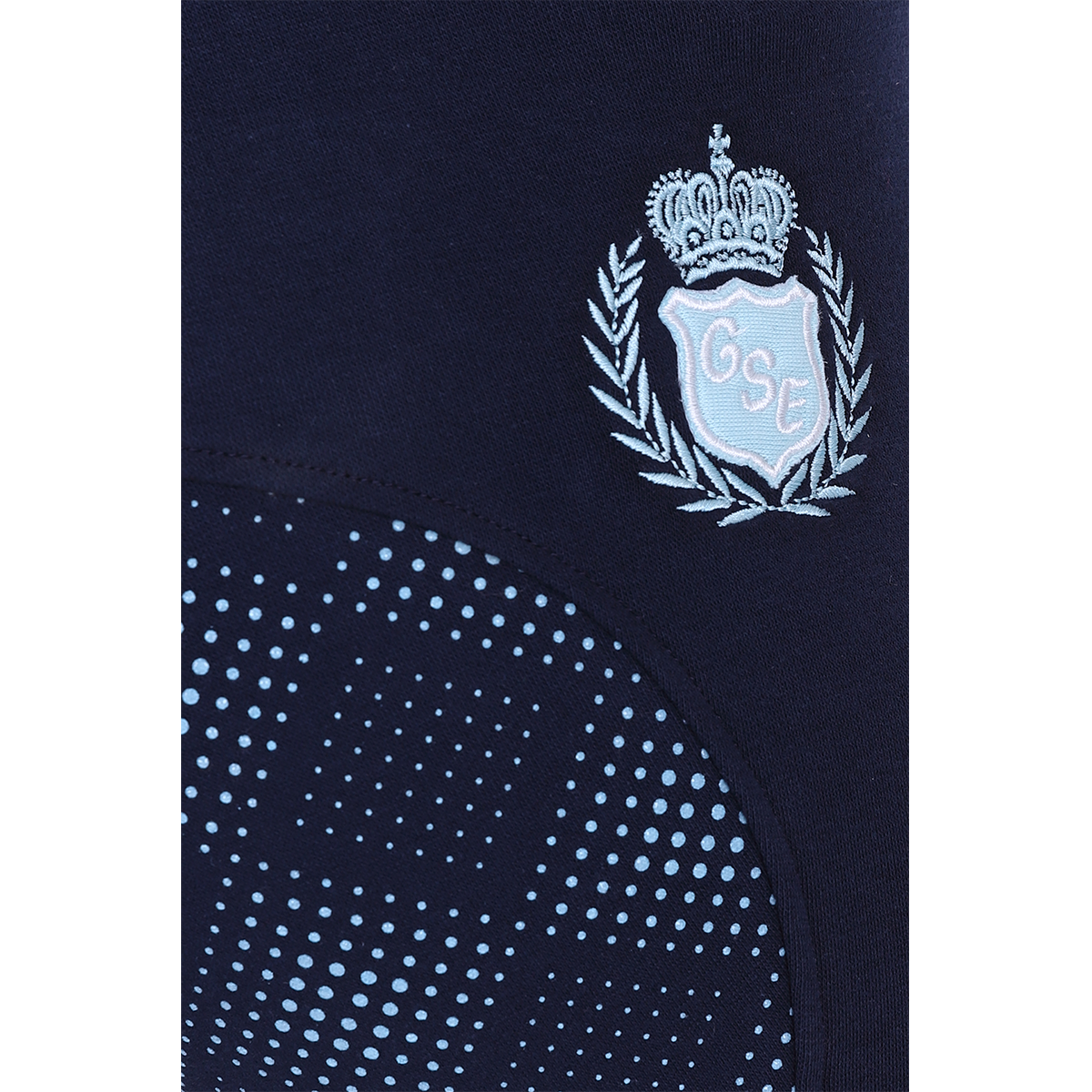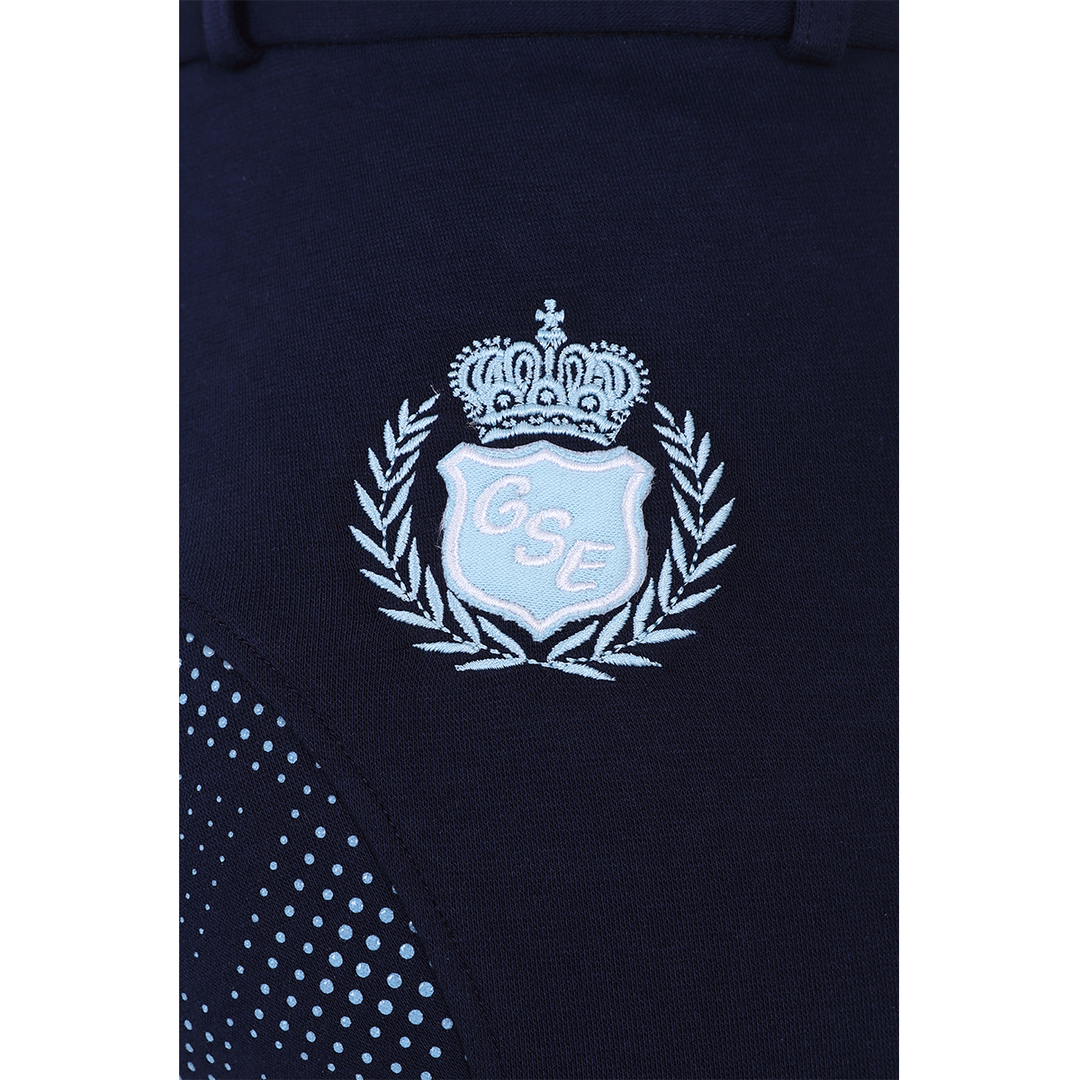 The Carol Jodhpurs have spotty full seat silicone grips, positioned strategically so that they increase the rider's stability in the saddle and reduces slipping. The silicone grips are in a contrasting colour that matches the embroidered emblem and the silicone has been designed to appear as a checkered pattern. Located on the right, at the back, the Carol Jodhpurs feature a GS Equestrian embroidered emblem which adds to the modern design. Furthermore, there is a GS Equestrian tag on the front left, just below one of the belt loops.