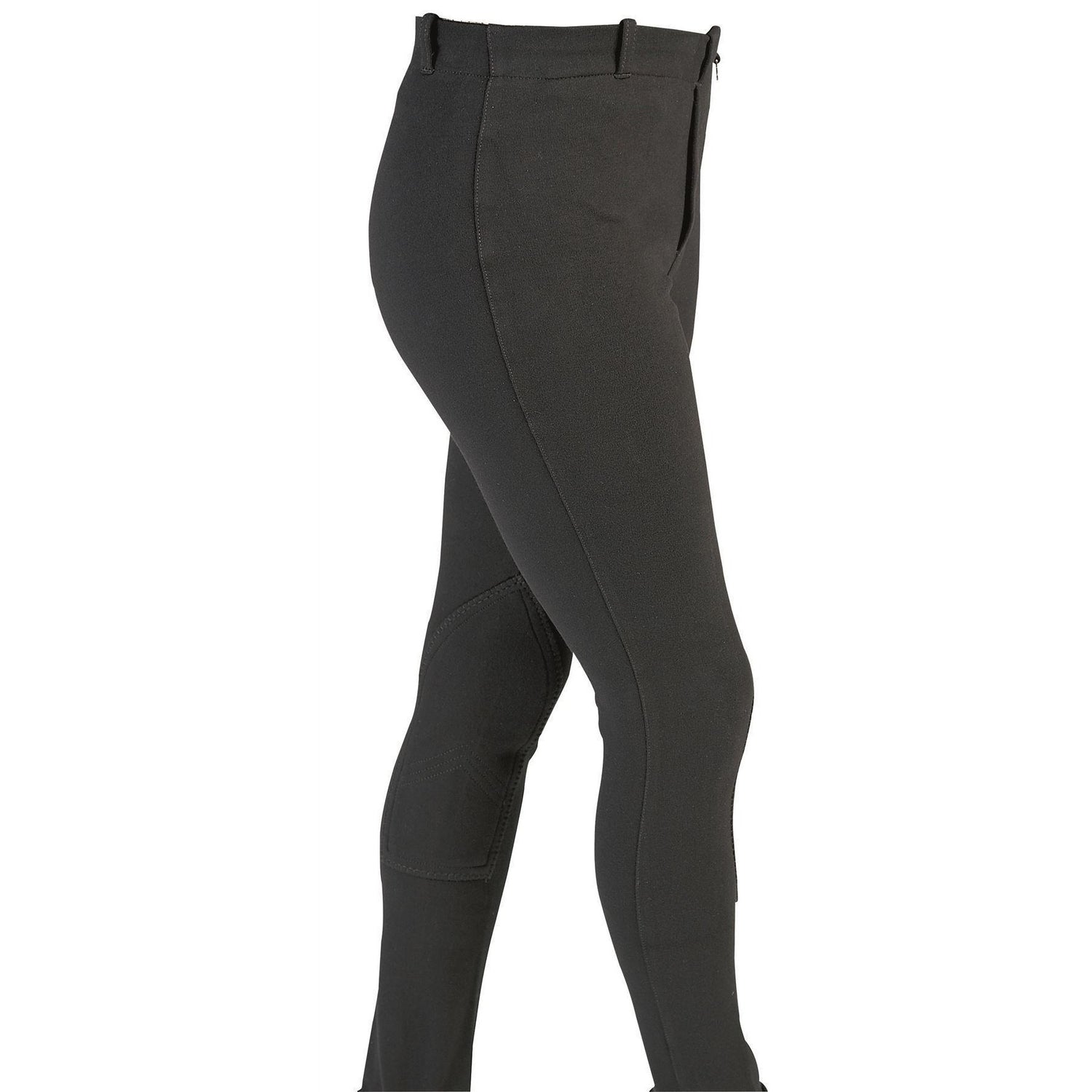 A classic child's jodhpur comfortable practical and traditional in style. Premium weight 94% Cotton and 6% Spandex for great 4 way stretch and comfort. Pull on jodhpur featuring false fly belt loops excellent reinforced stitching and elastic boot strap at the ankles (removable) with rolled up bottoms. Machine washable at 40A�C. Leg length: Regular.