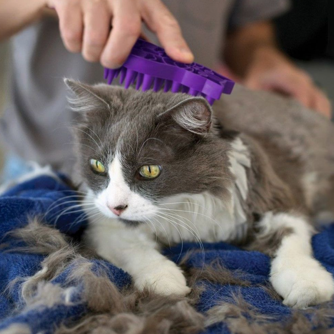 The KONG ZoomGroom® for Cats massages and grooms at the same time. The soft, rubber fingers are a magnet for loose hairs. Helps condition skin and reduce hairball formation. The gentle massage action calms cats, especially in potentially traumatic situations such as veterinarian visits.