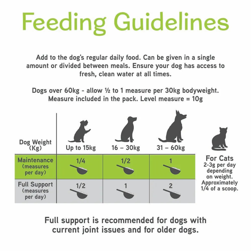 So for a 20kg dog we would recommend 1/2 a scoop for maintenance and 1 scoop if there are any signs of joint issues. Even slight stiffness following a walk or play is a sign of joint issues and therefore we would recommend the higher dose.