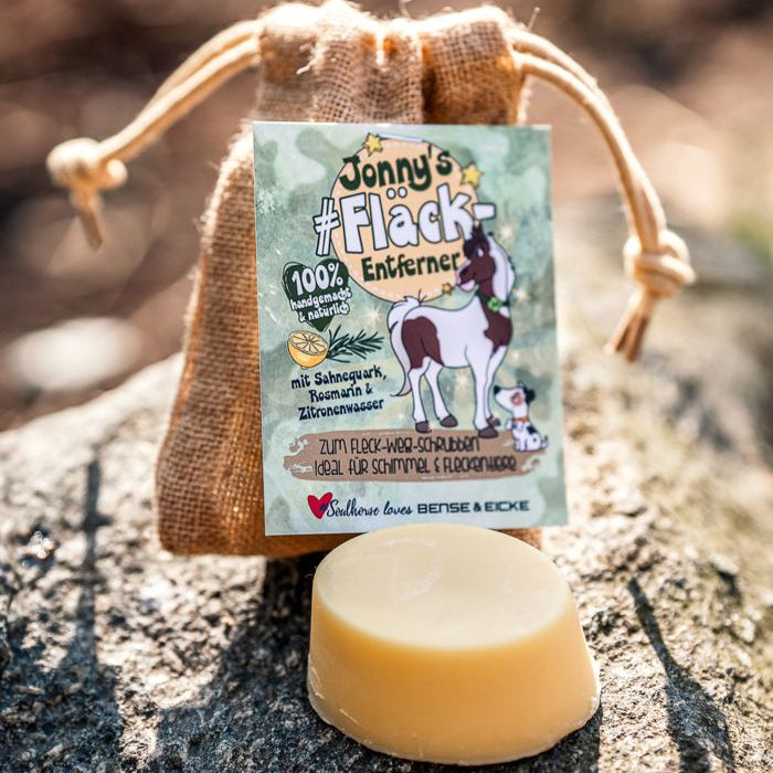 Discover the power of Soul Horse Jonny's Stain Remover, a handmade soap that transforms your horse’s coat and long hair to a polished shine. Crafted with a nourishing blend of cream curd cheese, olive oil, rosemary oil, and lemon water, it effortlessly lifts grass stains and manure. Simply lather into wet hair, focusing on stubborn spots like the tail and rump, then rinse to reveal a spotless, radiant finish. Treat your horse to this luxurious cleanse and watch other horses envy the gleam!
