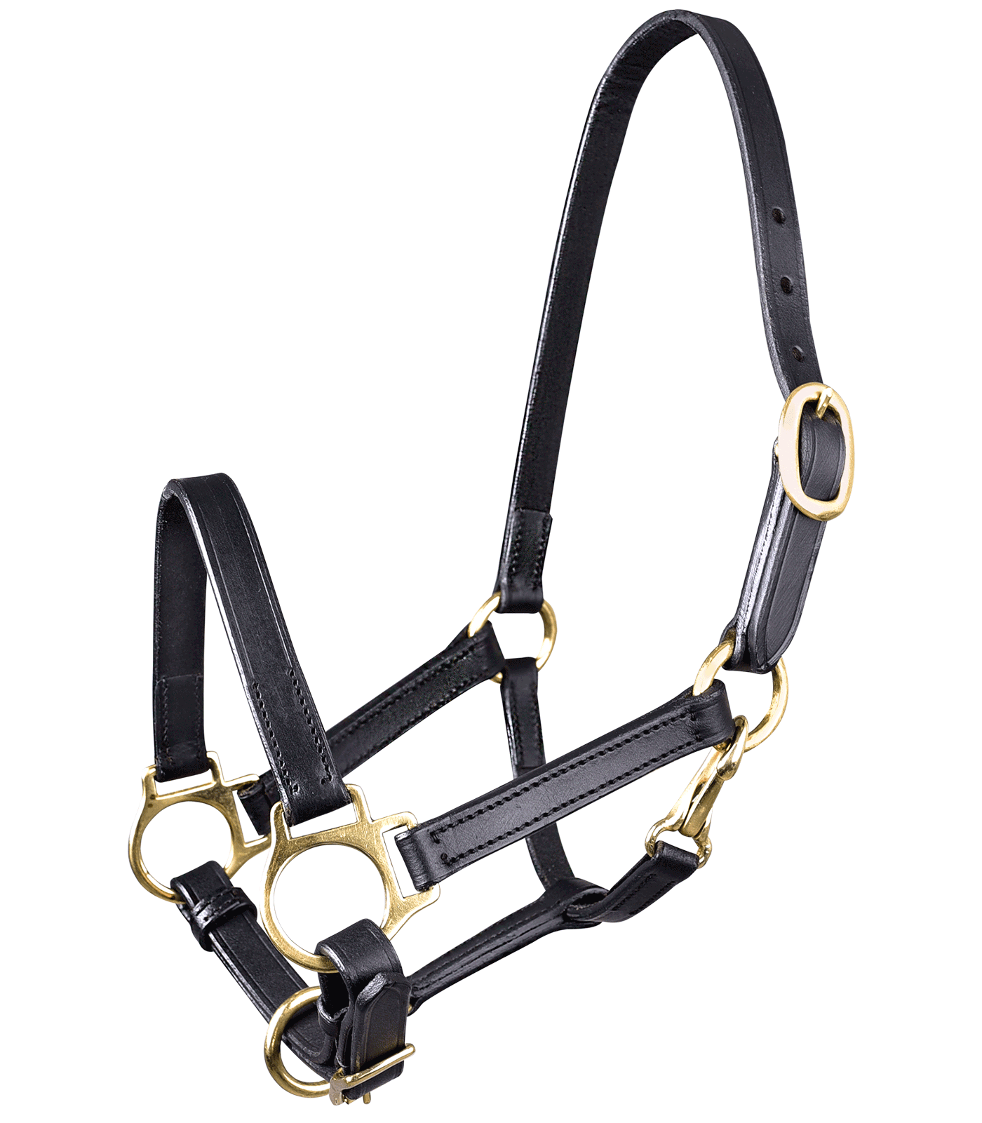 Hard-wearing leather halter for foals with brass-coloured fittings. Multi-adjustable at the poll and chin strap.