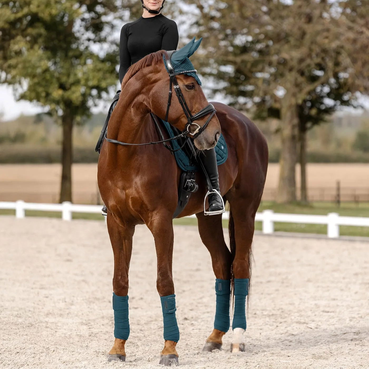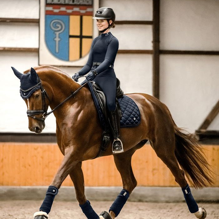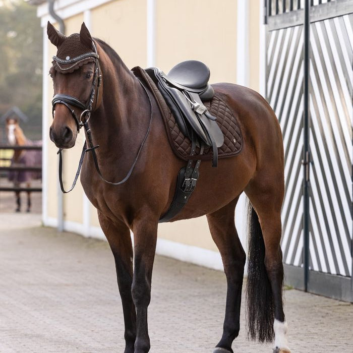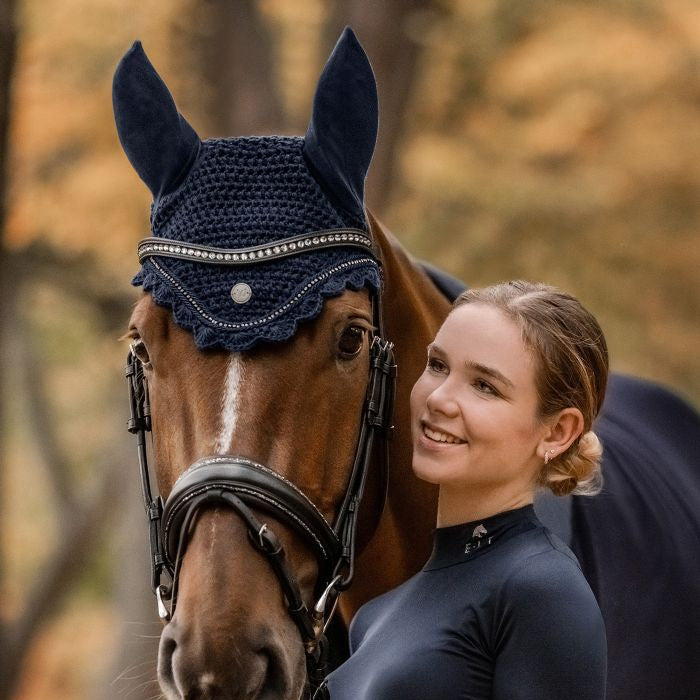High-quality fly veil with elasticated ears, matching our Nepal collection. A metal plate and a shimmering rhinestone band between two tonal decorative cords ensure an elegant appearance.